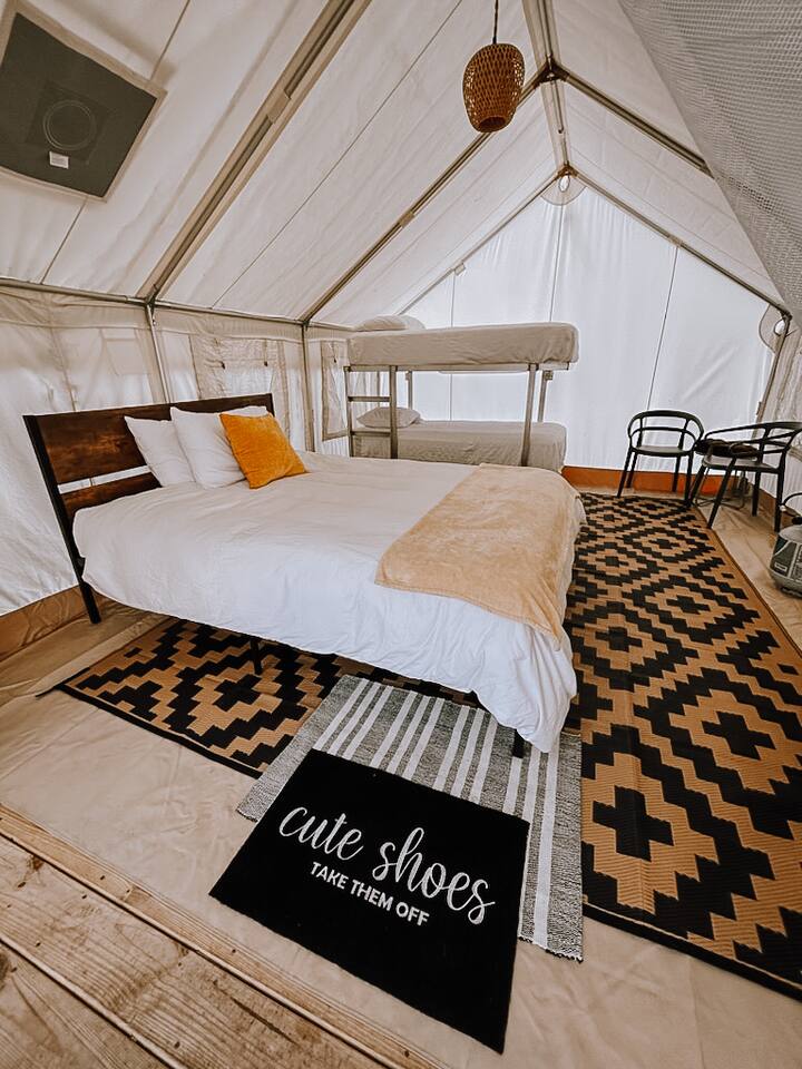 Citrus Tent: Glamping with Intention The Citrus Tent is your private retreat within Wonderfield’s waterfront Glamp Village, a small cluster of four thoughtfully placed glamp tents designed for immersion, comfort, and calm. Each canvas tent is approximately 12’ x 14’ and rises to 9 feet at its peak, set atop a custom wooden deck. The design balances creature comforts with proximity to nature—you’ll hear birds in the morning, frogs at night, and the quiet rhythm of the farm throughout the day. Inside the tent you’ll find: + A comfortable queen-sized bed + bunk bed with natural cotton and linen bedding + Intentional, eclectic furnishings sourced secondhand or locally + A small kitchenette setup for locally roasted coffee and your camp snacks + Solar-powered electricity for lighting, a fan, and charging devices + Just outside your tent is a private fire ring with a grill and provided firewood, perfect for evenings under the stars.