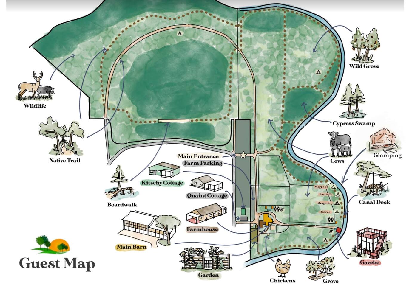 Explore the Land, Respectfully The Glamp Village occupies a peaceful 2-acre waterfront area within our larger 66-acre regenerative farm and nature sanctuary. Guests are invited to explore, wander, and connect with the land during their stay. Glamp Village amenities include: + Fire pits with grills and firewood + Eco-friendly outdoor compost toilets + An outdoor garden shower + Access to a traditional indoor bathroom at the farmhouse for guests who prefer it Farm-wide access includes: + Miles of private walking and hiking trails + A spring-fed canal for swimming, fishing, kayaking, canoeing, or paddleboarding (equipment included) + Citrus groves, food forests, and gardens (guests may upick what they can enjoy that day) + Opportunities to observe and meet farm animals + Abundant wildlife watching throughout the property Shared community spaces: + A restored main barn with tables, couches, and shared WiFi (the only WiFi available onsite) + A two-story waterfront gazebo overlooking a 10,000-acre protected nature preserve—ideal for sunrise and reflection + A covered barn space suitable for yoga, stretching, or quiet rest Digital detox, by design: None of our accommodations have TVs or in-unit WiFi. This is intentional and central to the Wonderfield experience. Guests are also invited to become Wonderfield naturalists by joining our living field guide on iNaturalist and discovering local flora and fauna during their stay.